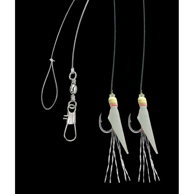 Mořský návazec se dvěma háčky velikost 6 potaženými pravou rybí kůží v přírodní barvě natural. Přirozený vzhled a pohyb ve vodě láká sleďe, makrely i menší tresky. Hlavní vlasec 0,45 mm, přívěs 0,40 mm, délka 150 cm, nosnost 10 kg.