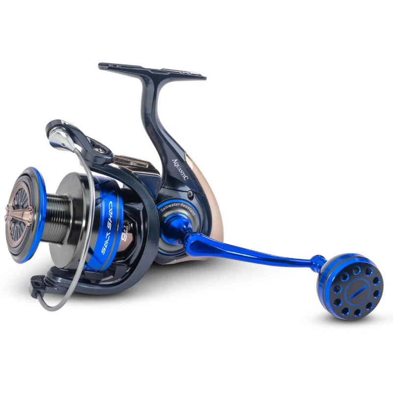 Aquantic Salt Shad Halibut 5000 je vysoce kvalitní mořský naviják naladěný na zátěžový rybolov a cílený lov halibuta. Nabízí plynulý chod díky 9+1 kuličkovým ložiskům z nerezové oceli a zároveň pevnou, torzně stabilní konstrukci s grafitovým tělem určeným do slané vody. Rychlá přední brzda Fast Drag pracuje s karbonovými brzdovými podložkami a umožňuje svižné doladění brzdného účinku během zdolávání. Výrazným prvkem je lehký, přesto velmi stabilní Air Rotor, který zlepšuje vyvážení a celkový komfort při delší práci s nástrahou. CNC obráběná hliníková klička s velkým hliníkovým úchopem sedí jistě v ruce i v náročných podmínkách na moři.