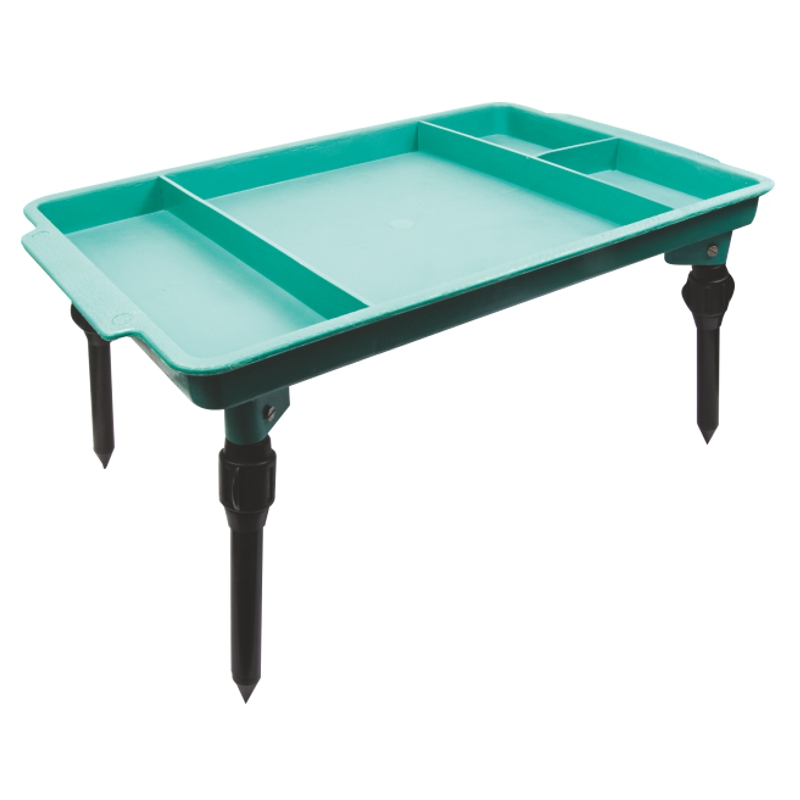 Praktický kaprový stolek s nastavitelnými nohami a rozdělenými přihrádkami pro organizaci rybářského vybavení. Stabilní konstrukce a lehký design pro snadnou přepravu.