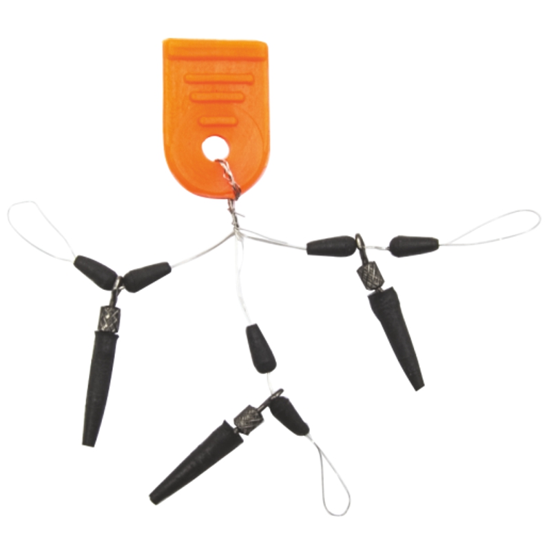 Praktická sada černých gumových zarážek s integrovanými obratlíky pro snadné a bezpečné uchycení návazců či zátěží. Ideální volba pro rybáře hledající rychlou výměnu montáže bez složitého převazování.